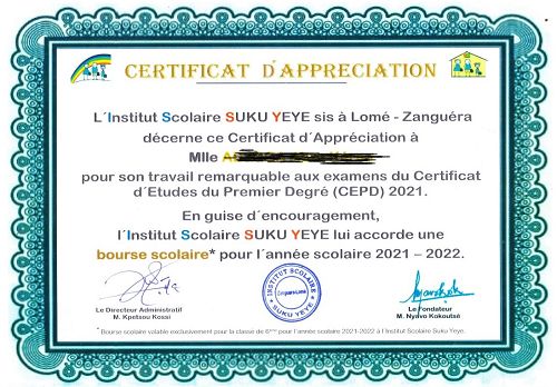 Pour la deuxième fois, nos élèves de la classe du CM2 ont participé du 15 au 17 juin à l'examen du CEPD (certificat de premier degré). Cette fois, Suku Yeye a présenté 23 candidats (précédemment 12). Sur les 23 candidats présentés, 22 ont réussi à l'examen. Une candidate fit partie des 5 meilleurs candidats du centre d´écrit. Malheureusement, ce résultat n'a pas suffi pour décrocher un tableau d'honneur comme l'an dernier. L'association de bienfaisance Suku Yeye - Togo Schulprojekt e.V. en Allemagne en collaboration avec l´Institut Scolaire Suku Yeye à Lomé ont décerné une bourse d´études à la lauréate. L'élève pourra donc fréquenter gratuitement la classe de 6ème pendant toute l'année scolaire 2021-2022.