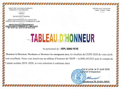 félicite notre personnel enseignant et classe notre école au tableau d´honneur de l´Inspection tout en l´exhortant à continuer sur la voie, celle du l´excellence et de la bonne pédagogie.