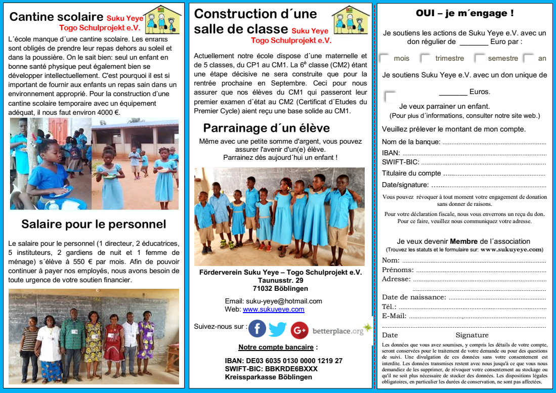 Les activités de Suku Yeye se développent rapidement et nous avons besoin de soutiens humains pour relever les défis d'un tel projet en expansion. Ainsi Suku Yeye e.V. a le plaisir de présenter ses nouveaux membres: M. Hans-Georg Mai et Mme Christiane Servini. Les deux nouveaux membres ont la tâche de développer des idées pour la réussite des projets et de présenter ces projets aux sponsors. Nous nous réjouissons d´avance du soutien de nos gestionnaires de projets et leur souhaitons bon courage au milieu de nous!