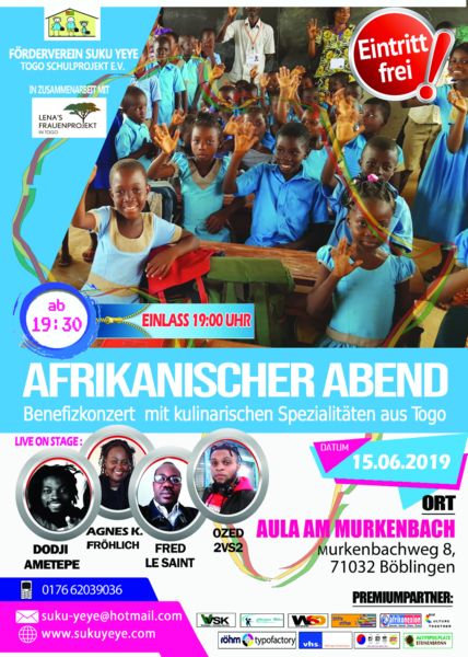 Förderverein Suku Yeye - Togo Schulprojekt e.V. vous invite à un concert de bienfaisance le 15 juin 2019 à la salle des fêtes de Murkenbach à Böblingen. En plus des sons et des rythmes africains, vous dégusterez des spécialités culinaires du Togo. Les recettes seront investies directement dans le projet d'école au Togo. Début: 19:00 heures. L'entrée est gratuite.