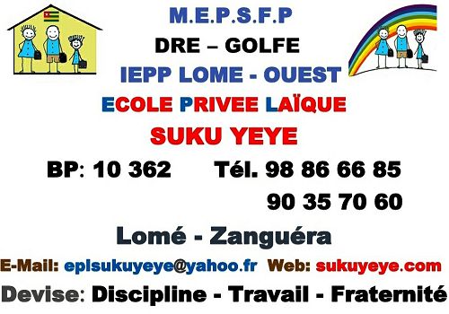 L´école de Suku Yeye comporte cinq classes. Du CP1 (Cours Préparatoire 1ère année) au CM1 (Cours Moyen 1ère année). En règle générale, l´école primaire au Togo se compose de six classes. La dernière classe, c´est-à-dire le CM2 (Cours Moyen 2ème année) est très importante, car c'est à ce stade que l´élève passe le premier examen d'état, le CEPD (Certificat d'études du Premier Cycle) en fin d'année scolaire pour entrer au collège. Étant donné que notre école est à sa première année d’études, nous considérons qu’il est mieux d’ouvrir le CM2 l’année prochaine avec les élèves du CM1 que nous formons à cet effet.